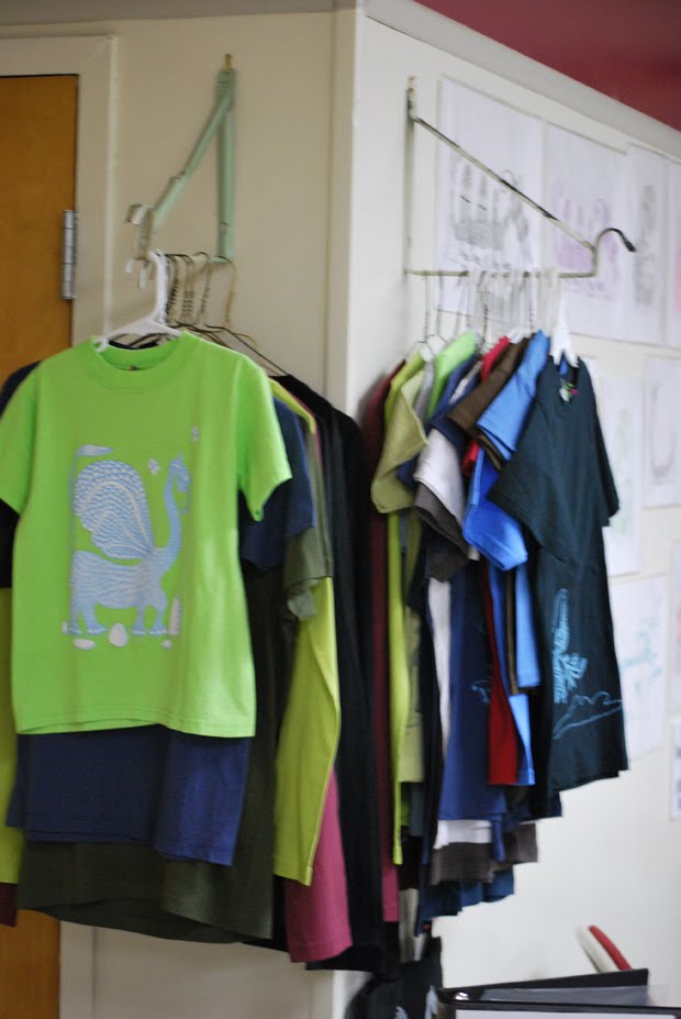 To add interest and so that customers could see the t-shirt designs without unfolding them, I used my lengths of plastic tubing to hang t-shirts from on the wall. I balanced the tubing on a push pin. It worked great and looked a lot better than using hangars. This method also avoids stretching the necks of the shirts. I like to use children's hangars for hanging t-shirts as far as possible. They are smaller and are less likely to stretch the neck holes.